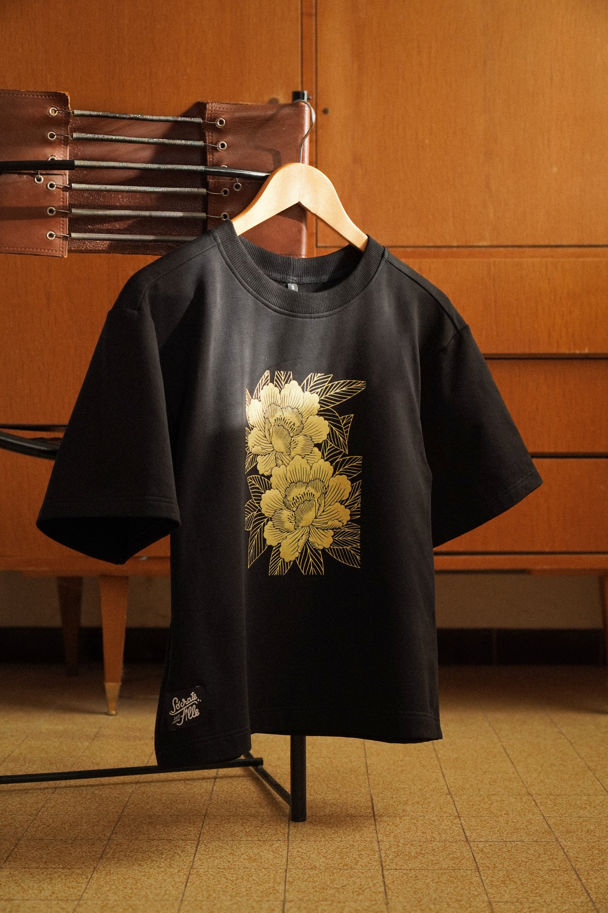 Motif Pivoine sérigraphié à l’atelier Barbastella, dans une teinte or mat